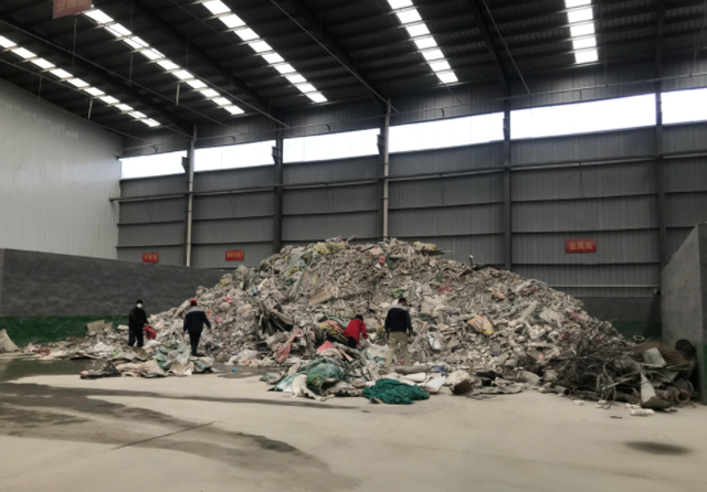 3月30日上午11點,記者跟隨李軍杰來到位于羅莊區羅城路與高都工業園路交會處的分揀處置中心,發現在該分揀處置中心的分揀區堆放著成山的裝飾裝修垃圾,4名工作人員正埋首其中,對垃圾進行分類。
