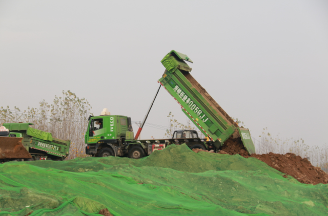 3月30日中午12點,在羅莊區南外環建筑垃圾消納場,記者看到,幾輛渣土運輸車正在將車斗上的建筑渣土傾卸進坑塘中。卸完車出場前,渣土運輸車經渣土車沖洗設備洗了個澡后,才離開消納場。