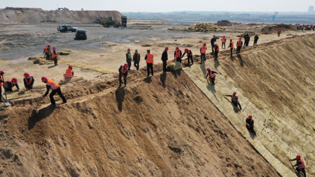 位于棋盤井礦區的東辰煤礦,機器作業聲不絕于耳,記者在現場看到,工人們正忙著進行排土場毛石砌護。據了解,東辰煤礦治理區屬于棋盤井蒙西地區集中連片治理中線工程,由鄂托克旗煤炭行業協會牽頭,內蒙古煤礦設計研究院進行設計,沿線六保、東辰等9家煤礦企業投資建設,于2020年4月全面啟動。全部治理面積達17.1平方公里,綠化面積達1.8平方公里,建成后可形成一條橫跨棋盤井礦區約7公里的人工景觀帶,以及頂部13.1平方公里平地,為實施光伏風電、生態種植等