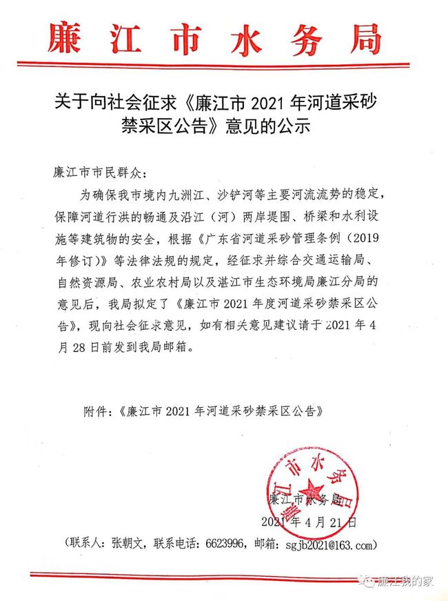關于向社會征求《廉江市2021年河道采砂禁采區公告》意見的公示廉江市2021年河道采砂禁采區公告
