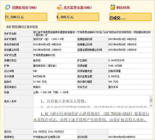 此礦權位于寧波市寧海縣西店鎮嶺口村,礦區面積約0.343平方千米,控制資源量1049.17萬立方米(2745.18萬噸),其中原生礦1016.28萬立方米(2672.82萬噸),風化礦32.89萬立方米(72.36萬噸),年生產規模540萬噸/年,出讓年限5年,起拍價2.75億元,經過158輪激烈競價,最終被寧波香巖山礦業有限公司以12.47億元拍下,溢價率高達353.5%。