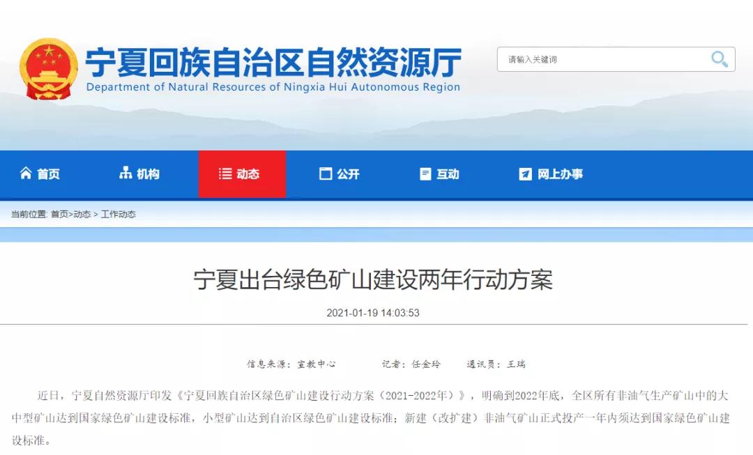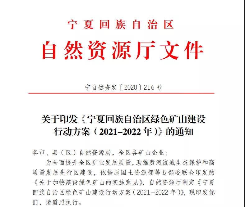 為全面提升全區礦業發展質量,助推黃河流域生態保護和高質量發展先行區建設,寧夏回族自治區自然資源廳發布》之后,以堅持“生態優先、綠色發展,政府引導、企業主建,統籌謀劃、全面實施”的基本原則,2021年全面推進綠色礦山建設。通過健全政府引導、部門聯動、企業主建、第三方評估、社會監督的舉措,推動綠色礦山建設工作具體工作實施。