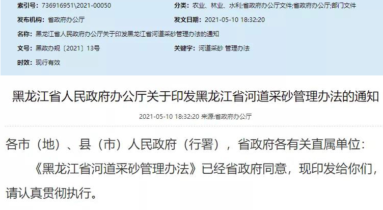 近日,黑龍江省人民政府辦公廳發布《關于印發黑龍江省河道采砂管理辦法的通知》,表示該辦法自2021年5月9日起施行。《黑龍江省人民政府辦公廳關于印發黑龍江省河道采砂管理辦法的通知》(黑政辦發〔2013〕11號)同時廢止。
