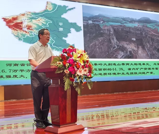 河南省自然資源廳二級巡視員馮進城代表專家組發言。馮進城介紹了近年來河南省在綠色礦山建設和礦山生產修復方面所做的工作及經驗等。