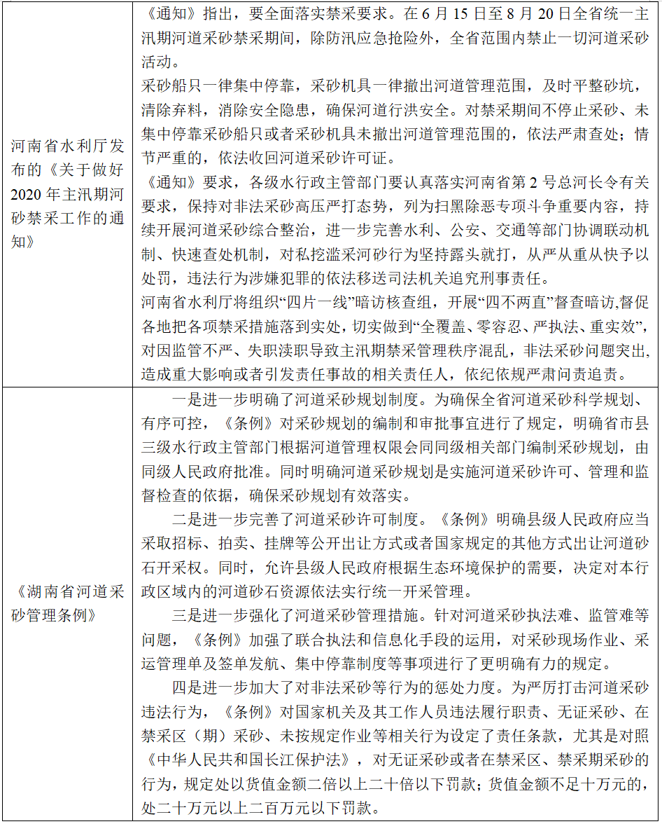 隨著政策的逐漸完善和民眾環(huán)保意識的增強,砂石行業(yè)的發(fā)展進入“機會和挑戰(zhàn)”并存時期,砂石礦山的發(fā)展正逐步走向正規(guī)化、規(guī)模化、綠色化。2019年11月,工信部、國家發(fā)改委等十部門聯(lián)合印發(fā)《關(guān)于推進機制砂石行業(yè)高質(zhì)量發(fā)展的若干意見》指出,到2025年形成完善合理的機制砂石供應(yīng)保障體系;2020年3月,國家發(fā)改委聯(lián)合十五部門印發(fā)《關(guān)于促進砂石行業(yè)健康有序發(fā)展的指導(dǎo)意見》要求,綜合施策、多措并舉,合理控制河湖砂開采,逐步