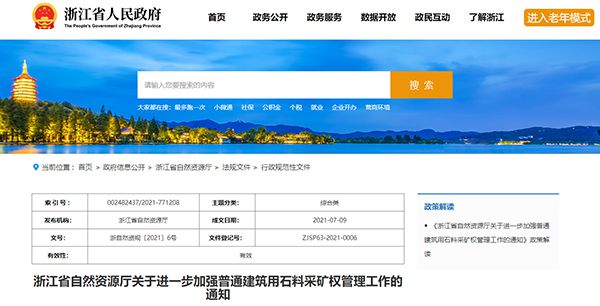 日前,浙江省自然資源廳印發了《關于進一步加強普通建筑用石料采礦權管理工作的通知》(浙自然資規﹝2021﹞6號,以下簡稱《通知》),自2021年9月1日起實施,有效期五年。作為普通建筑用石料采礦權管理的重要文件,《通知》涉及設置管理、準入管控、出讓調控、出讓監督等普通建筑用石料礦產資源管理工作內容。
