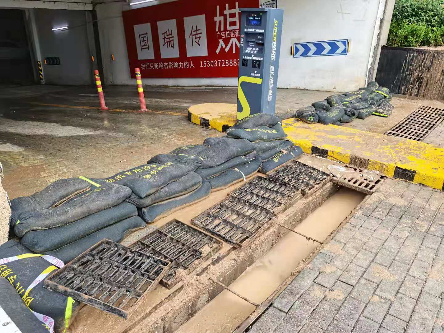 居民小區地下停車場入口堆起的沙袋