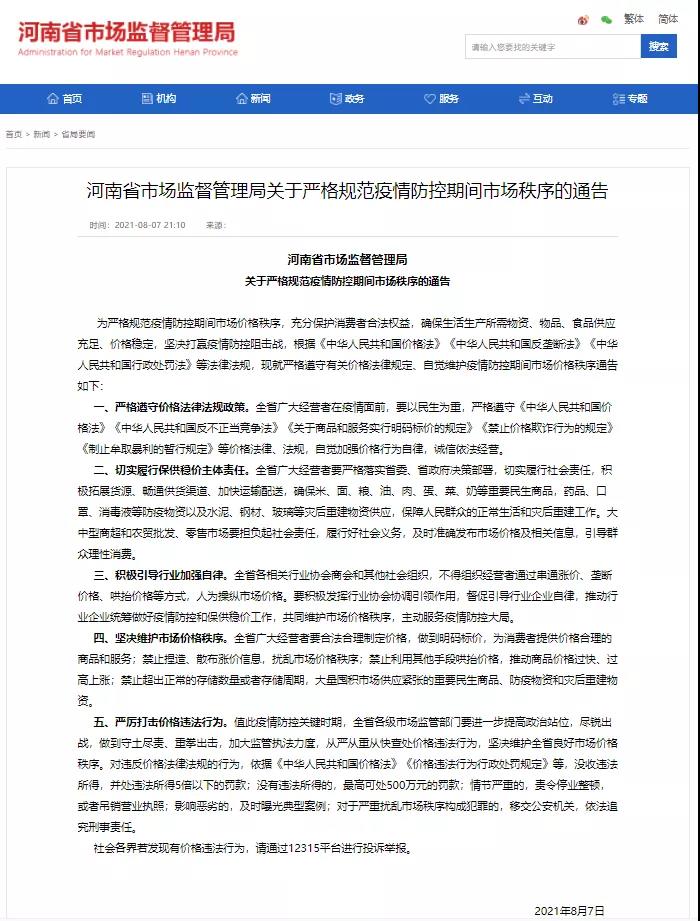 河南省市場監(jiān)管局在此提醒:社會各界若發(fā)現(xiàn)有價(jià)格違法行為,請通過12315平臺進(jìn)行投訴舉報(bào)。