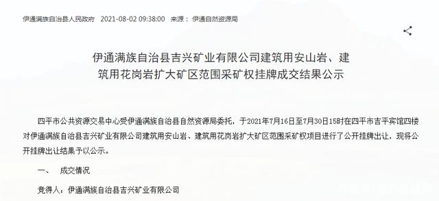 近日,伊通滿族自治縣吉興礦業有限公司成功取得擴大范圍礦區建筑用安山巖、建筑用花崗巖礦采礦權,礦權出讓年限30年,建成投產后年產能將達500萬立方米。