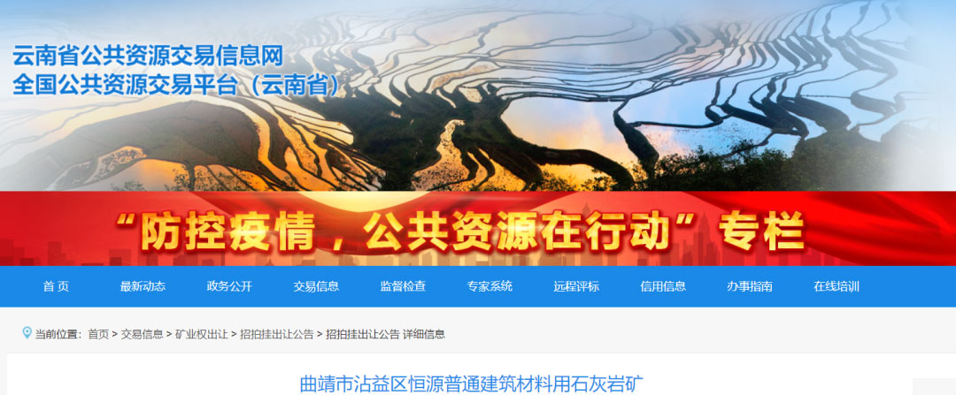 曲靖市沾益區恒源普通建筑材料用石灰巖礦,保有資源量:753.93萬噸,開采方式:露天開采,生產規模:48萬噸/年,出讓年限:14年,掛牌起始價:366.24萬元。