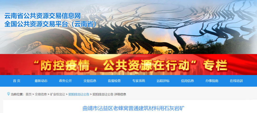 曲靖市沾益區老蜂窩普通建筑材料用石灰巖礦,保有資源量:3272.3萬噸,開采方式:露天開采,生產規模:99萬噸/年,出讓年限:30年,掛牌起始價:1489.98萬元。