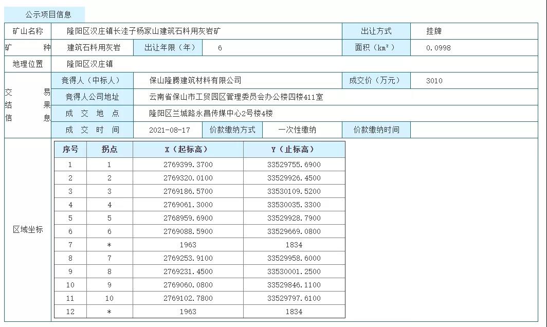 2021年08月18日,隆陽區漢莊鎮長洼子楊家山建筑石料用灰巖礦采礦權以掛牌方式出讓,根據《中華人民共和國礦產資源法》《中華人民共和國拍賣法》/《中華人民共和國招標投標法》《礦產資源勘查區塊登記管理辦法》/《礦產資源開采登記管理辦法》《礦業權交易規則》,以及《國務院辦公廳關于印發整合建立統一的公共資源交易平臺工作方案的通知》等相關規定,現將成交結果公示如下: