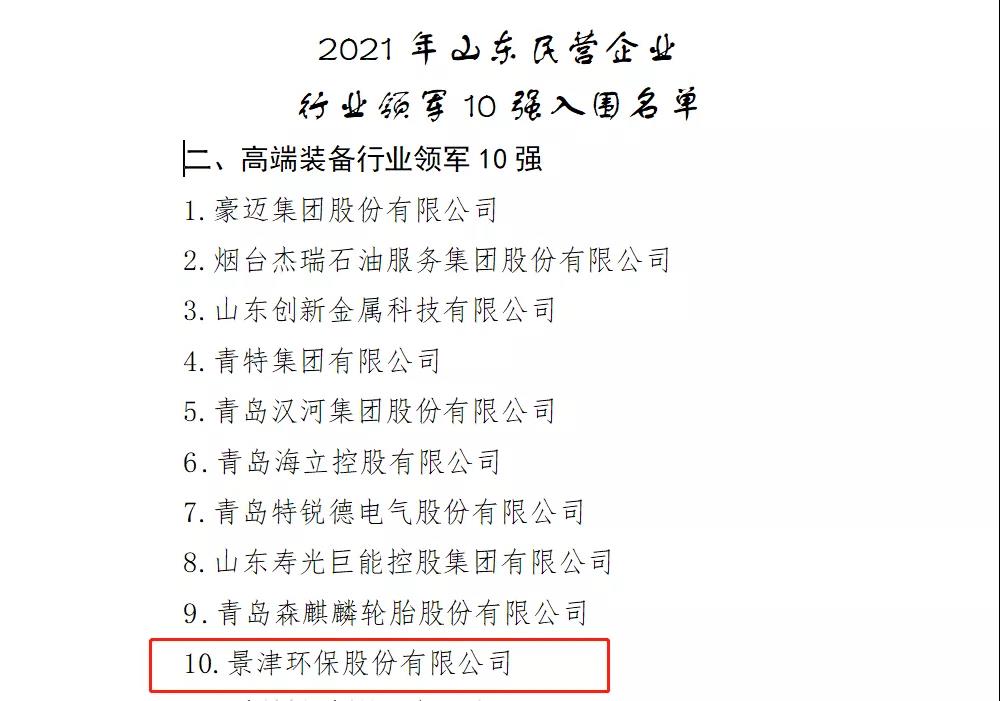 景津環保成功入選2021年山東民營企業行業領軍10強