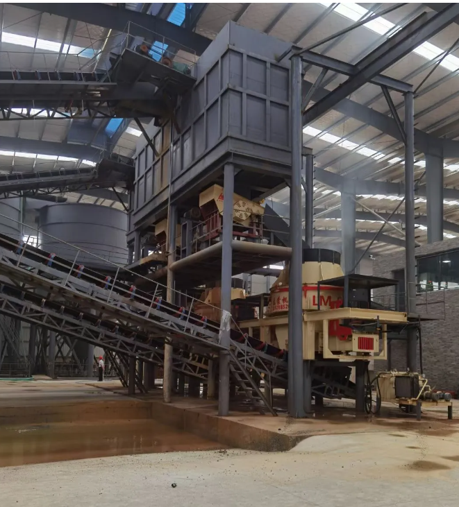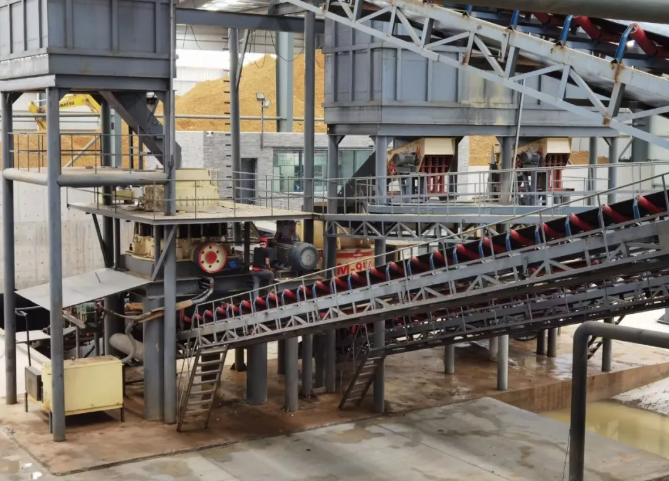 沖擊式破碎機(jī),同時配備了YKJ振動篩、螺旋洗砂機(jī)、ZKX系列細(xì)砂回收一體機(jī)等篩分及洗砂裝備,污水處理階段則采用液壓板框壓濾機(jī)等。