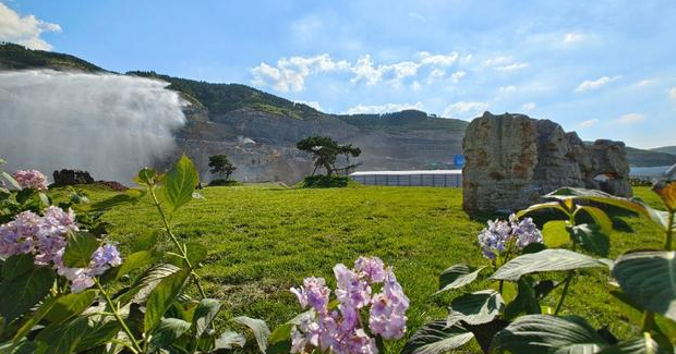 如今,洪泉石料廠廠區道路兩旁的樹木郁郁蔥蔥,放眼遠處的山坡,更是一派綠草如茵、鮮花盛開的景象,“生態公園式礦山”已經初具雛形。