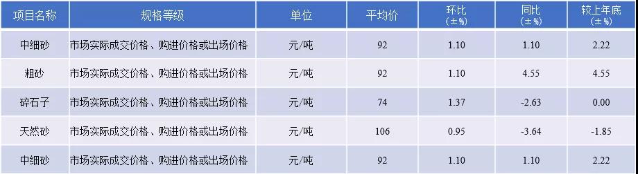 天然砂均價106元/噸,環(huán)比上升0.95 %。