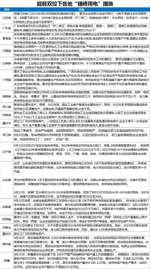 近日,發改委在例行新聞發布會上對9個能耗升高省區重點點名,分別是青海、寧夏、廣西、廣東、福建、新疆、云南、陜西、江蘇,9地上半年能耗強度同比不降反升。此外,還有10個省份的能耗降低率未達到進度要求,全國節能形勢十分嚴峻。相關文件下發后,多省積極落實中央政策,隨著“能耗雙控”在多地升級,從限電的力度及范圍來看,高耗能、高排放企業節能減排刻不容緩,不少地區直接限產、限電,甚至停產,其中廣東、江蘇尤為嚴重,具體匯總如下: