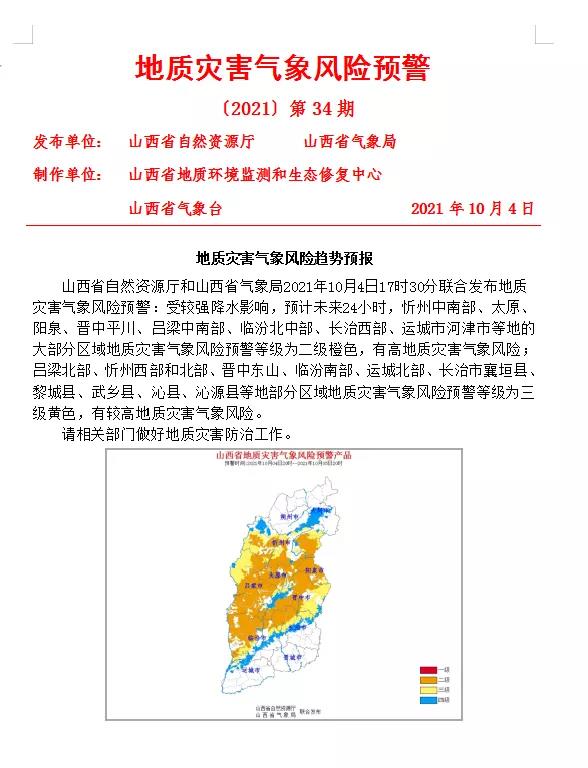 獲悉,自10月2日開始,山西大部分地區出現降雨,局地有暴雨。山西省防汛抗旱指揮部決定自10月4日12時啟動省級防汛Ⅳ級應急響應。10月2日至3日,山西連續發布地質災害、山洪災害氣象風險預警和暴雨藍色預警。