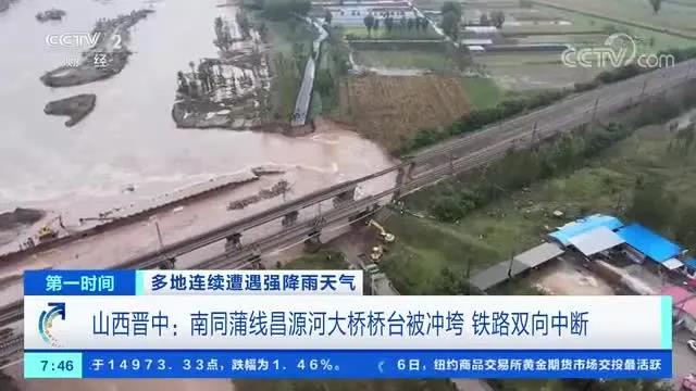 6日,受連續降雨影響,在山西晉中,南同蒲線祁縣至東觀之間的昌源河大橋橋臺被沖垮,枕木懸空,影響行車。中國鐵路太原局巡檢人員發現險情后,立即攔停列車,800多名救援人員攜帶機具趕赴現場,全面搶險。受昌源河大橋橋臺沖垮影響,多趟列車停運或晚點。太原局集團公司也在104個客運車站增開改簽、退票專口,做好旅客車票退改簽服務。