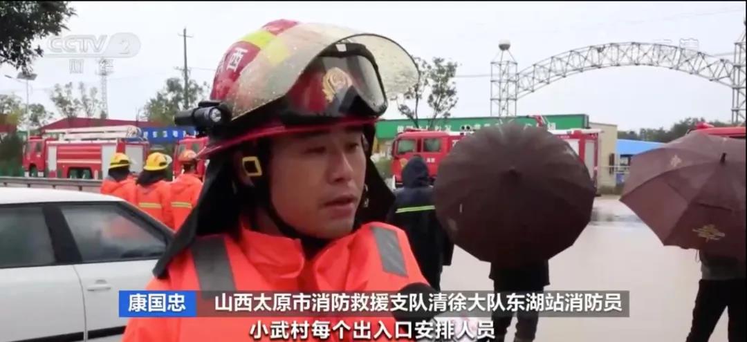 山西太原市消防救援支隊清徐大隊東湖站消防員 康國忠:村里靠上游的地方,水有一米深,小武村每個出入口安排人員,防止疏散轉移的人員在中途返回。另一方面,周邊受災村莊有好多老人小孩被困,我們隨時出動準備救援。