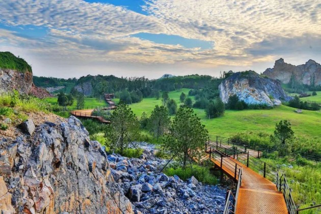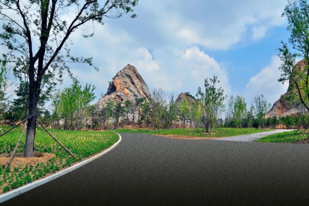 當然,礦山修復也必須因地制宜,與當地生態充分融合。所以在項目實施過程中,東方園林將在爆破中產生的大塊山石,用在了森林公園內的景觀道路和景石墻建設,把這些石料在現場進行切割和重現鋪裝,做出景觀效果。