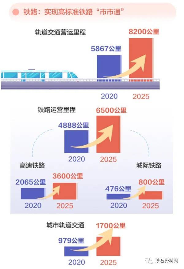 《規(guī)劃》制定了“十四五”時(shí)期廣東省綜合交通運(yùn)輸體系發(fā)展目標(biāo),到2025年,軌道交通營(yíng)運(yùn)里程要由5867公里提升至8200公里:其中鐵路運(yùn)營(yíng)里程從4888公里提升至6500公里,城市軌道交通從979公里提升至1700公里。公路通車?yán)锍虅t由22萬公里提升至22.5萬公里,其中高速公路從10488公里提升至12500公里。
