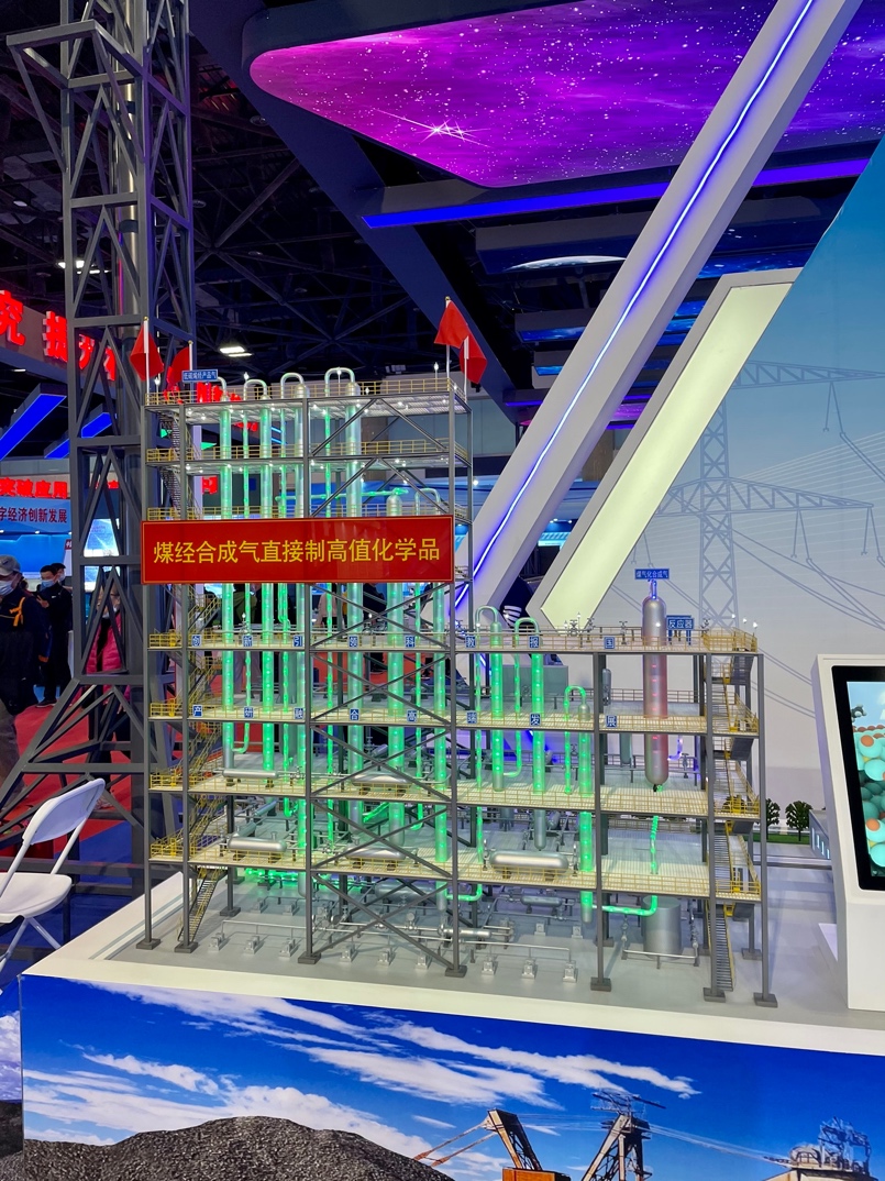 展品介紹人說,我國化學品生產每年消耗約1.2億噸原油。結合我國富煤、缺油、少氣的化石資源稟賦,將煤炭清潔高效轉化制高值化學品有著非常重要的戰略意義。這項技術突破了德國傳統合成氣轉化路徑,摒棄了工藝水循環,縮短了工藝流程,降低了碳排放。