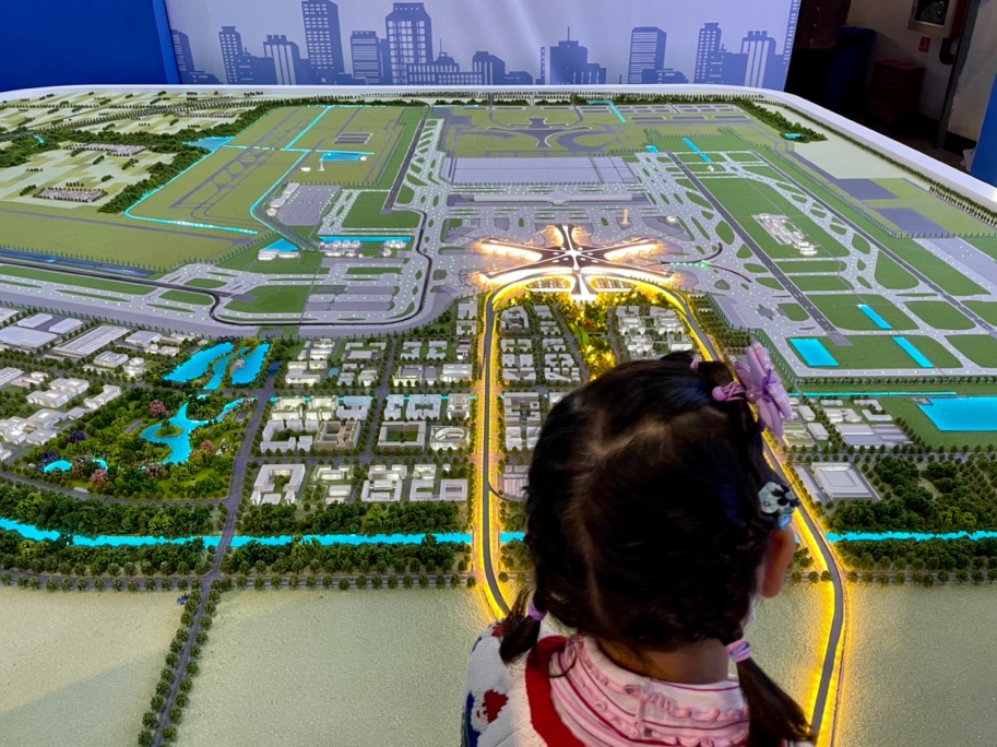“寶寶快看!這是大興國際機場!”聽到媽媽的話,一個小女孩跑到了大興國際機場模擬展品前。