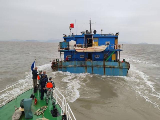 在溫州蒼南霞關水域,執法人員發現一艘自吸自卸式涉海運輸內河砂石船“達興X”,指揮部成員單位經現場會商,快速部署實施攔截處置方案。