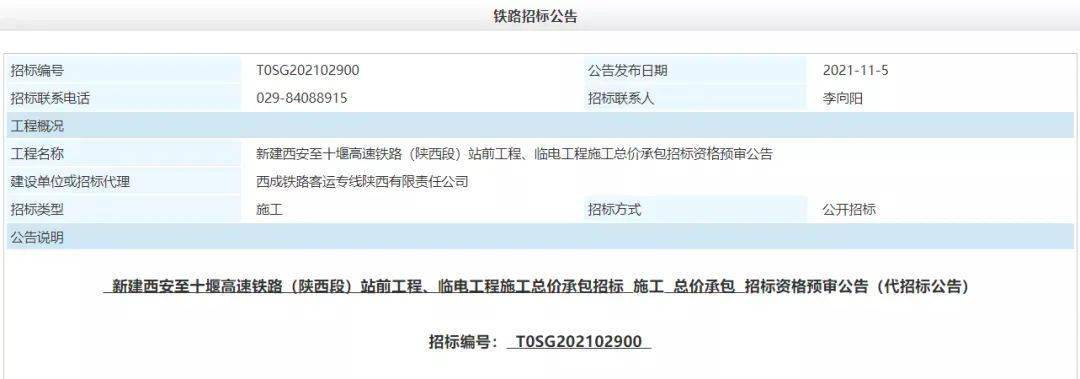 11月5日,在初步設計批復以后,《新建西安至十堰高速鐵路(陜西段)站前工程、臨電工程施工總價承包招標資格預審公告》、《新建西安至十堰高速鐵路(陜西段)“四電”系統集成工程施工總價承包招標》正式發布。
