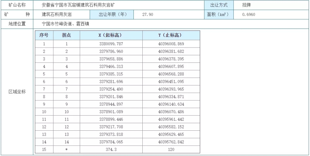 安徽省寧國市瓦窯鋪建筑石料用灰巖礦采礦權出讓年限為27.93年,拍賣(掛牌)起始價為人民幣94000.00萬元,最小增價幅度為人民幣1000萬元,每一最新報價的增價幅度須為最小加增幅度或其整倍數。采用有底價增價方式,未達到拍賣條件的轉為掛牌方式出讓,掛牌期限屆滿,宣布最高報價及其報價者,并詢問競買人是否愿意繼續競價,有愿意繼續競價的,通過現場競價確定競得人。不低于底價的最高報價者為競得人。