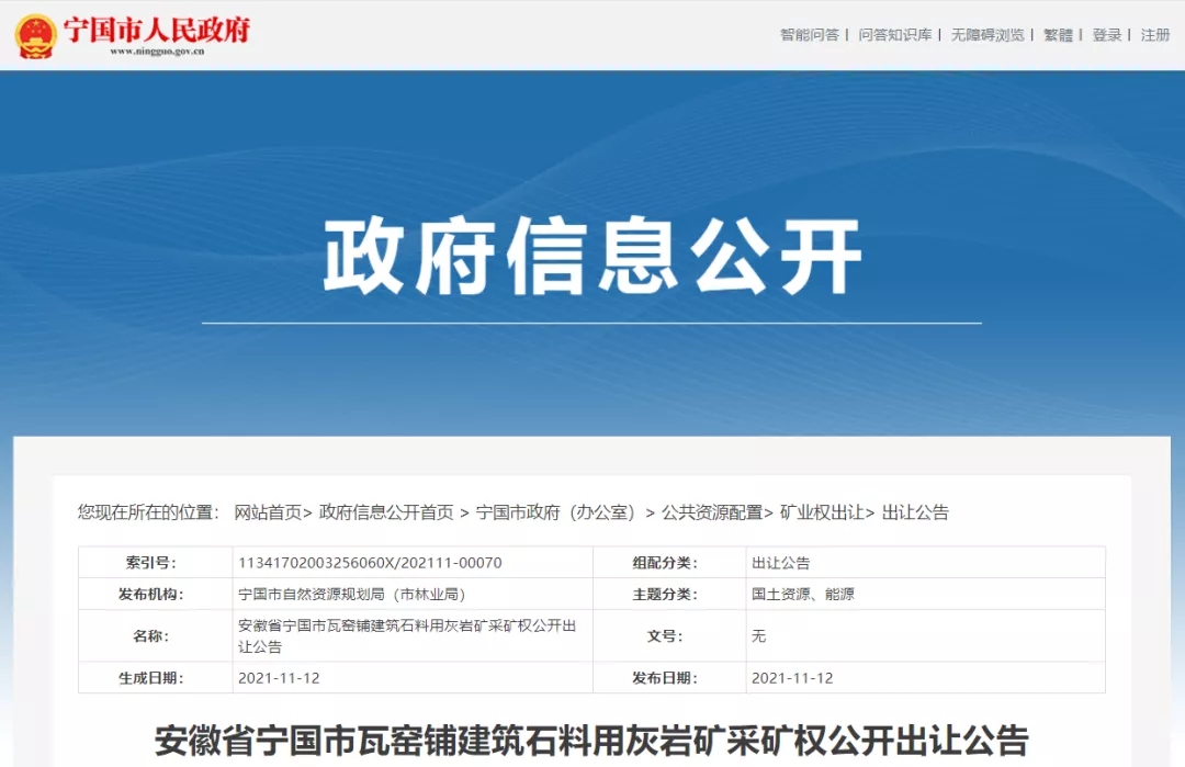 安徽省寧國市瓦窯鋪建筑石料用灰巖礦采礦權掛牌出讓公告