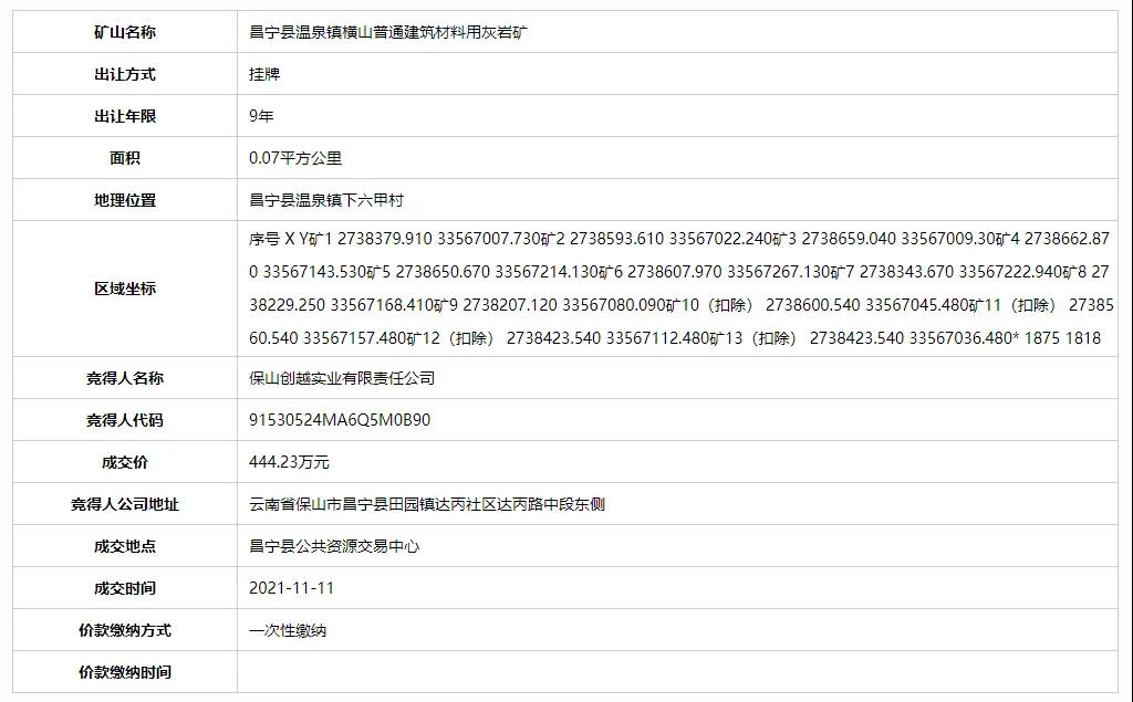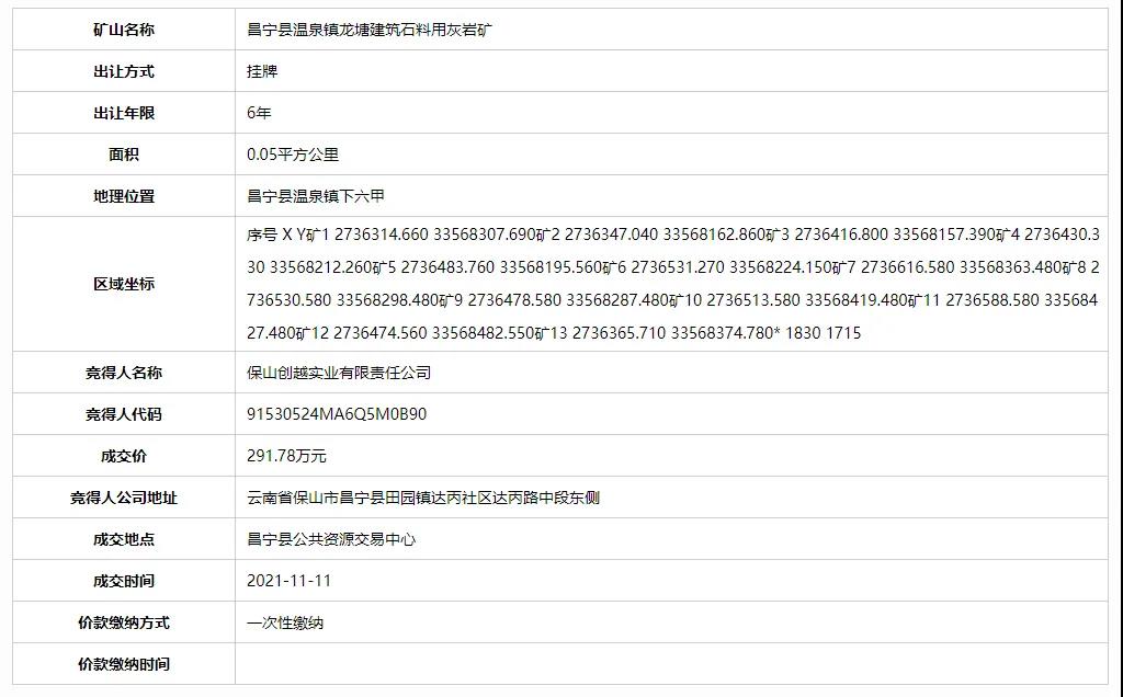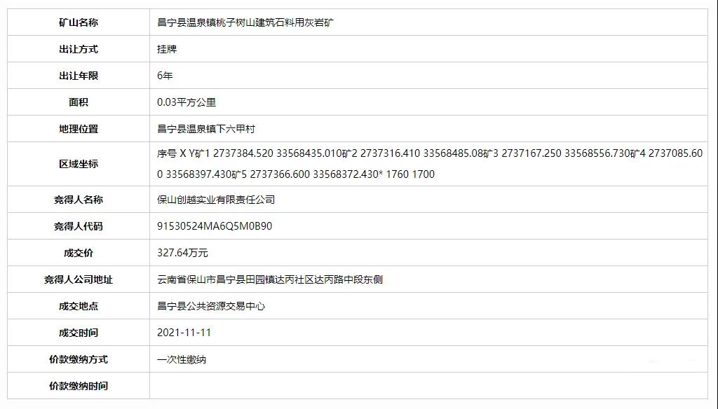 11月11日,保山創越實業有限責任公司成功競得云南省保山市昌寧縣三宗砂石采礦權。