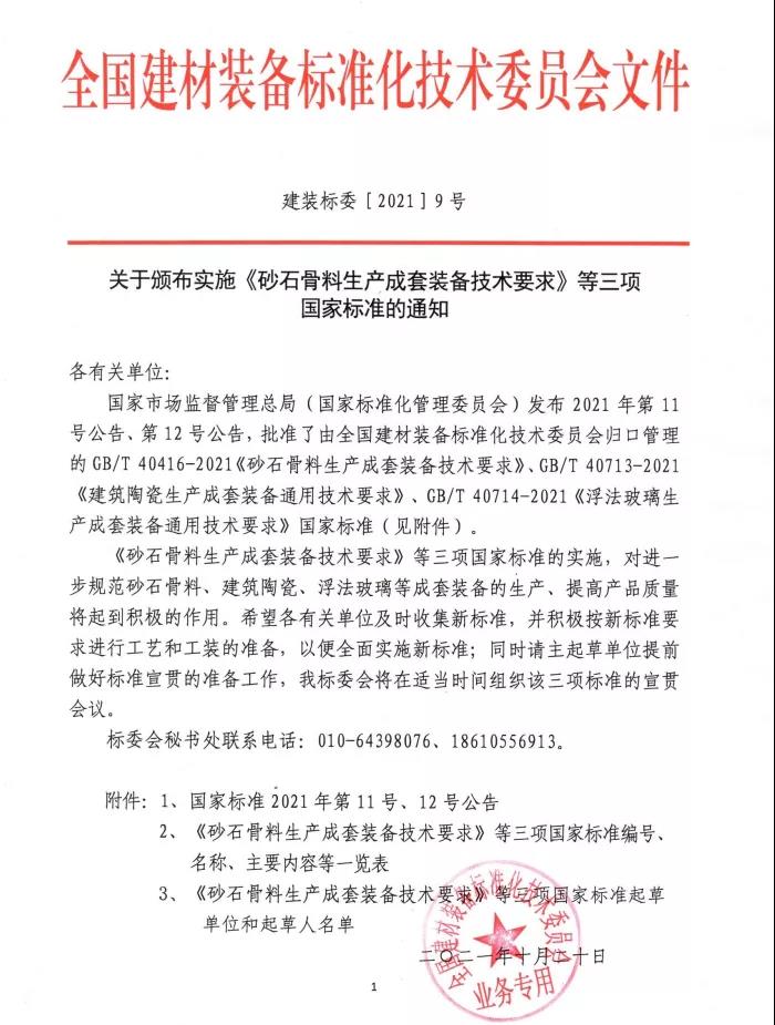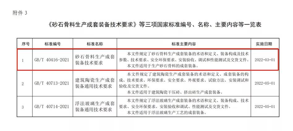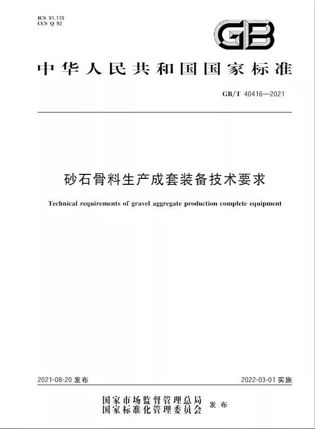 近日,國(guó)家市場(chǎng)監(jiān)督管理總局(國(guó)家標(biāo)準(zhǔn)化管理委員會(huì))發(fā)布2021年第11號(hào)公告、第12號(hào)公告,批準(zhǔn)了由全國(guó)建材裝備標(biāo)準(zhǔn)化技術(shù)委員會(huì)歸口管理的GB/T 40416-2021《砂石骨料生產(chǎn)成套裝備技術(shù)要求》等國(guó)家標(biāo)準(zhǔn),并將于2022年3月1日起正式實(shí)施。