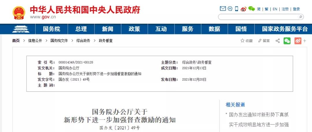國務院辦公廳關于新形勢下進一步加強督查激勵的通知國辦發〔2021〕49號