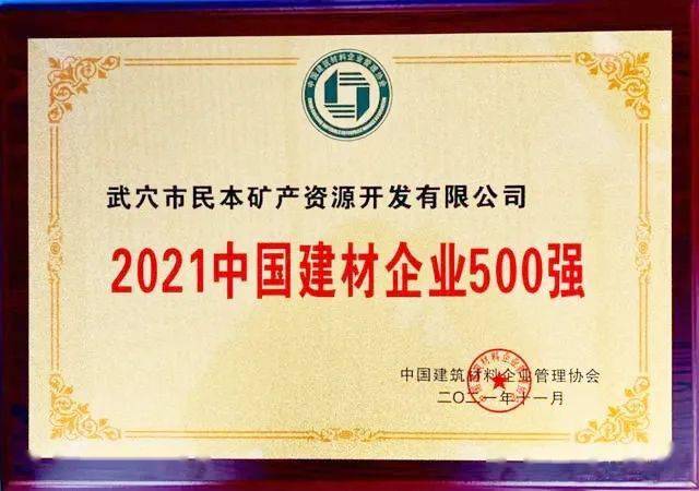 12月17日,由中國建筑材料企業管理協會組織的2021年中國建材企業500強系列發布活動在貴州貴陽舉行。湖北武穴市民本礦產資源開發有限公司榮登2021中國建材企業500強榜單,位列第223位。