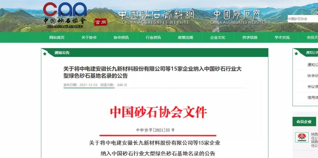 在中國砂石協會開展的2020年度中國砂石行業大型綠色砂石基地評選工作中,申報資料初審、專家實地核查和現場評估基礎上,經專家組評審,并經過公示,中電建安徽長九新材料股份有限公司“年產7000萬噸石灰巖綠色砂石基地”項目被納入2020年度中國砂石行業大型綠色砂石基地名錄。