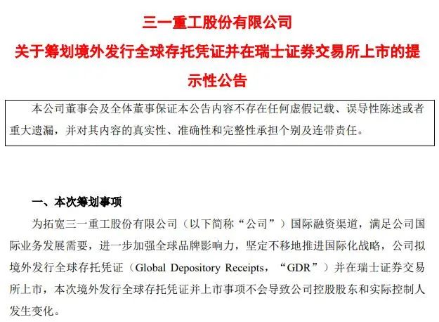 昨日晚間,三一重工發(fā)布公告稱(chēng),為拓寬三一重工股份有限公司(以下簡(jiǎn)稱(chēng)“公司”)國(guó)際融資渠道,滿足公司國(guó)際業(yè)務(wù)發(fā)展需要,進(jìn)一步加強(qiáng)全球品牌影響力,堅(jiān)定不移地推進(jìn)國(guó)際化戰(zhàn)略,公司擬境外發(fā)行全球存托憑證(GlobalDepositoryReceipts,“GDR”)并在瑞士證券交易所上市。