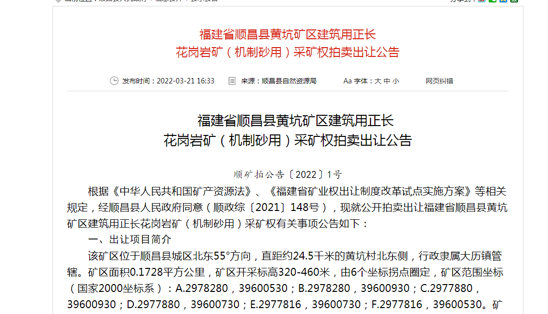 3月21日,福建省順昌縣黃坑礦區建筑用正長花崗巖礦(機制砂用)拍賣出讓,拍賣起始價1762萬元,增價幅度為50萬元或50萬元的整數倍,擬出讓10年(含基建期0.6年),設計生產規模為50萬立方米/年。礦區面積0.1728平方千米,礦石總資源量(推斷類型)為497.08萬立方米,擬出讓可采儲量469.61萬立方米。