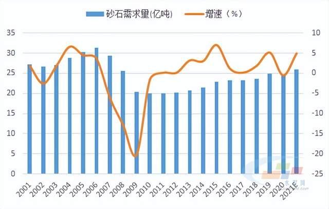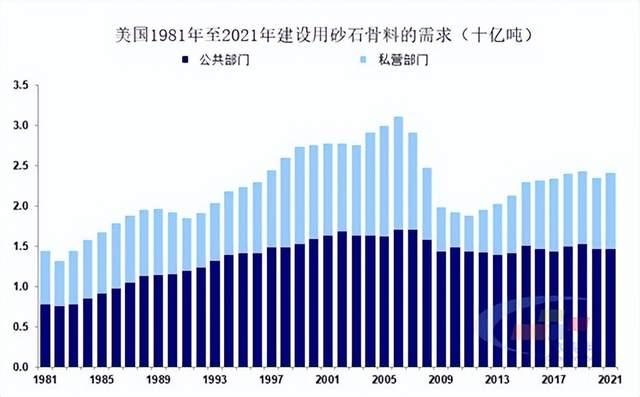 根據美國地質局數據,2021年,美國砂石總需求達26億噸,同比增長4.97%,近年來砂石需求呈小幅上升趨勢。