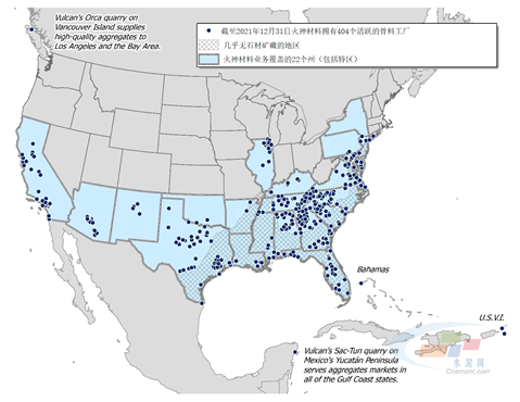 作為美國最大的骨料供應商,火神材料有其獨特的行業(yè)地位,據公司財報披露,2021年四季度,公司營收占美國前十大建筑材料生產商總和的28.66%,穩(wěn)坐第一(收購第六大US Concrete后進一步達到34.5%)。截至2021年12月31日,公司業(yè)務已覆蓋美國22個州,有404家骨料工廠,69家瀝青工廠,173家混凝土工廠以及1家鈣工廠,骨料總儲量高達156億噸。
