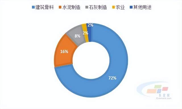 從用途來看,據美國地質局估計,約72%的碎石用作建筑骨料,主要用于道路建設和維護,約16%用于水泥制造業(yè),8%用于石灰制造,2%用于農業(yè),其余2%用于化學等其他用途。