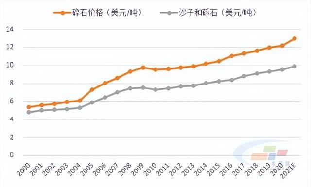 價格方面,美國的砂石骨料價格總體呈上升漲趨勢,沙子和礫石、碎石從2000年以來分別上漲了105.82%和141.19%。2021年,美國沙子和礫石的平均價格為9.9美元/噸,同比增長3.34%,碎石價格為13美元/噸,同比增長6.38%,碎石價格長期高于沙子和礫石的價格。