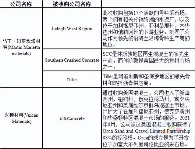 美國骨料行業(yè)相對其他行業(yè)更為分散,但具體而言,其頭部企業(yè)地位穩(wěn)固,環(huán)境和分區(qū)法規(guī)使骨料行業(yè)越來越難以擴大現有的采石場和發(fā)展新的采石場業(yè)務,目前業(yè)內公司通常通過收購以進入新市場和擴大市占率。