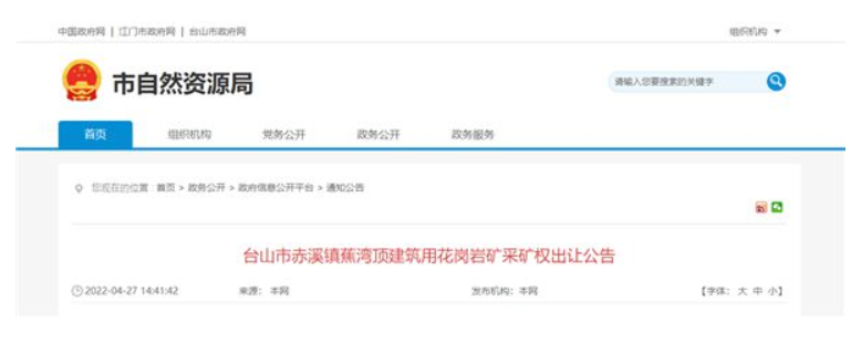 4月27日,廣東省臺山市自然資源局發布臺山市赤溪鎮蕉灣頂建筑用花崗巖礦采礦權出讓公告,資源儲量超2億方,擬出讓26年,起始價超18億元。