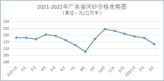 2022年一季度,全省河砂購進價為每立方米217元,一、二、三月河砂購進價分別為每立方米219元、218元和213元,海砂(淡化處理)一季度購進價為每立方米271元。碎石平均購進價為每立方米188元,機制砂平均購進價為每立方米162元。