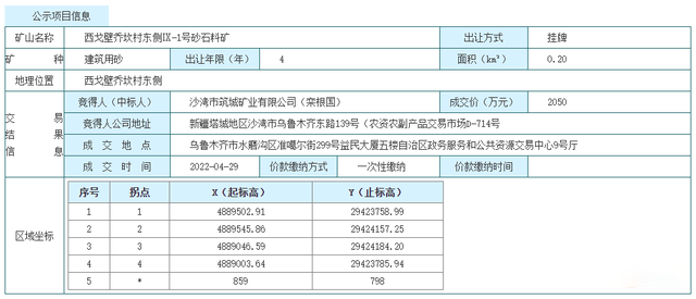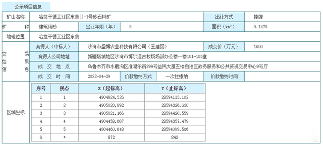 4月29日,新疆沙灣兩宗建筑用砂礦采礦權成功出讓,溢價率分別為737.56%與1150%,累計成交價為3700萬元。