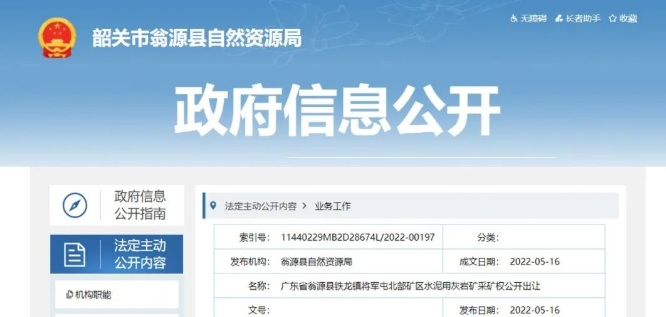 5月16日,韶關市翁源縣自然資源局發布廣東省翁源縣鐵龍鎮將軍屯北部礦區水泥用灰巖礦采礦權公開出讓公告,建筑用石灰巖礦石資源儲量超5000萬噸,出讓21年,起始價2.15億元。