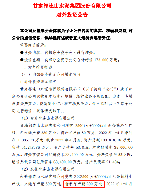 (1)青海祁連山水泥有限公司:青海祁連山水泥有限公司現有2500t/d+5000t/d兩條熟料生產線,年水泥產能380萬噸,商砼年產能80萬方,2022年1-4月凈利潤-1,385.73萬元,截止2022年4月底,資產總額100,818.18萬元,負債54,248.86萬元,資產負債率53.81%。本次擬增資35,000.00萬元。增資前該公司注冊資本33,400.00萬元,資產負債率53.81%,增資后該公司注冊資本68,400.00萬元,資產負債率21.43%。