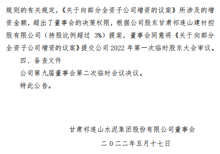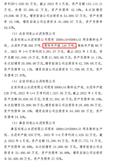 (4)古浪祁連山水泥有限公司:古浪祁連山水泥有限公司現有5000t/d熟料生產線,水泥年產能220萬噸,2022年1-4月凈利潤1,537.50萬元,截止2022年4月底,資產總額59,038.05萬元,負債22,492.40萬元,資產負債率38.10%。本次擬增資25,000.00萬元。增資前該公司注冊資本29,400.00萬元,資產負債率38.10%,增資后該公司注冊資本54,400.00萬元,資產負債率24.52%。